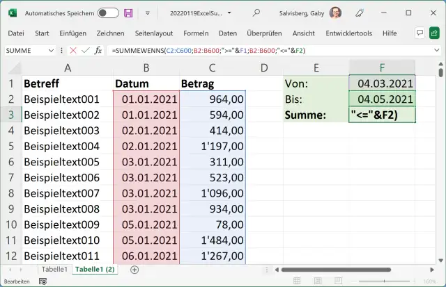 Angenommen, die zu addierenden Beträge stehen in C2 bis C600, die zu prüfenden Kalenderdaten in B2 bis B600. In F1 steht das «Von»-Datum, in F2 das «Bis»-Datum. In F3 möchten wir nun alle Beträge addieren, die zwischen den beiden Daten liegen. Greifen Sie zu dieser Formel: