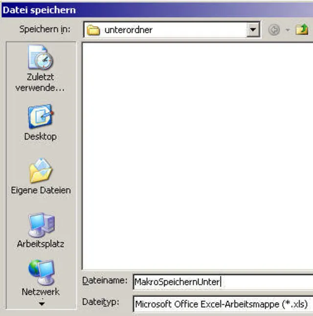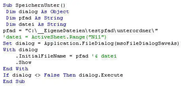 Wenn Sie dieses Makro in der jetztigen Ausführung starten, öffnet sich der Dialog mit dem hier als Beispiel gesetzten Pfad «C:\__EigeneDateien\testpfadNterordner\». Den passen Sie natürlich noch an Ihren gewünschten Pfad an. Beim Ausführen des Makros brauchen Sie dann nur noch den Dateinamen zu ergänzen und die Datei zu speichern.