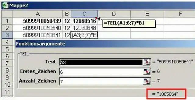 Verwenden Sie dafür die Funktion TEIL. Sie können so eine bestimmte Anzahl Zeichen ab der von Ihnen gewünschten Stelle "extrahieren". Im folgenden Beispiel wurde die extrahierte Zahl (ab der 6. Stelle 7 Zeichen) mit 12 multipliziert. Um nur die Zahl zu extrahieren, verwenden Sie die Funktion TEIL ohne weitere Berechnung. Im Funktionsassistenten wird bereits dargestellt, welche Zeichen das Ergebnis der eingestellten TEIL-Funktion sind.