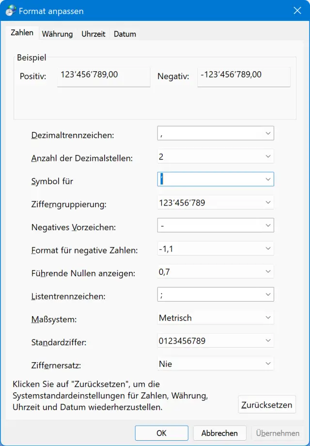 Im Feld hinter Symbol für Zifferngruppierung dürfte der Inhalt bei Ihnen und bei Ihrem Kollegen gleich aussehen – zumindest auf den ersten Blick. Denn wenn man sehr genau hinguckt und die Einstellung anhand eines vergrösserten Screenshots vergleicht, sind da durchaus Unterschiede auszumachen.
