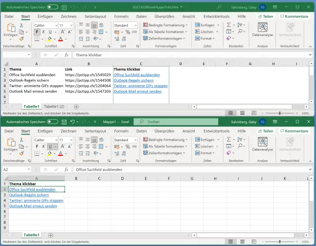Auch HTML kann als Zwischenformat dienen. Speichern Sie die Excel-Datei via Datei/Speichern unter (oder Datei/Kopie speichern), indem Sie beim Dateityp auf Webseite (*.htm;*.html) umschalten. Klicken Sie auf Speichern und bestätigen Sie allfällige Meldefenster in Bezug auf Features, die verloren gehen könnten. Schliessen Sie die Datei. Öffnen Sie Excel wieder und gehen Sie zu Datei/Öffnen. Wählen Sie beim Dateityp HTML aus und öffnen Sie die vorhin gespeicherte HTML-Datei. In dieser (obiger Teil des nachfolgenden Bildes) können Sie die Spalte C markieren, mit Ctrl+C kopieren und mit Ctrl+V wieder in eine richtige Excel-Datei (unterer Bildteil) einfügen. Die Links bleiben dabei erhalten.
