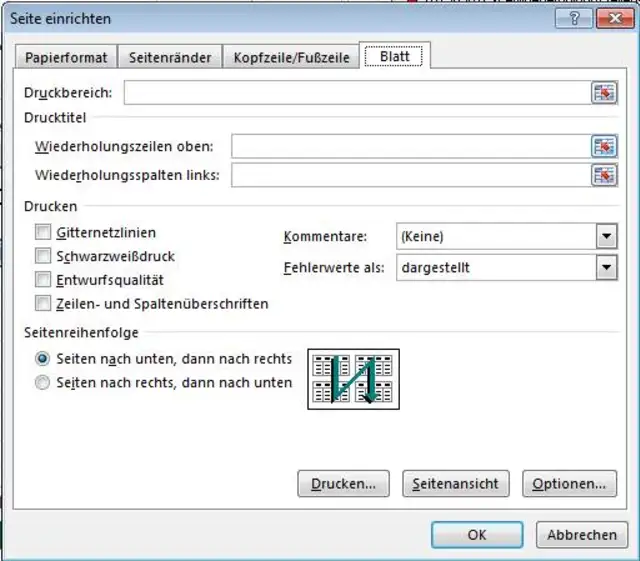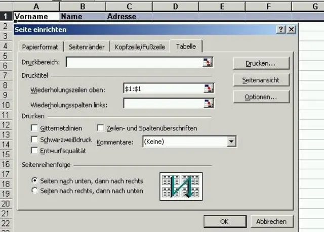 In älteren Excel-Versionen funktioniert das ganz ähnlich. Zum Beispiel in Excel 2003 (siehe nachfolgenden Screenshot) finden Sie dieselben Bedienelemente über Datei/Seite einrichten/Tabelle.