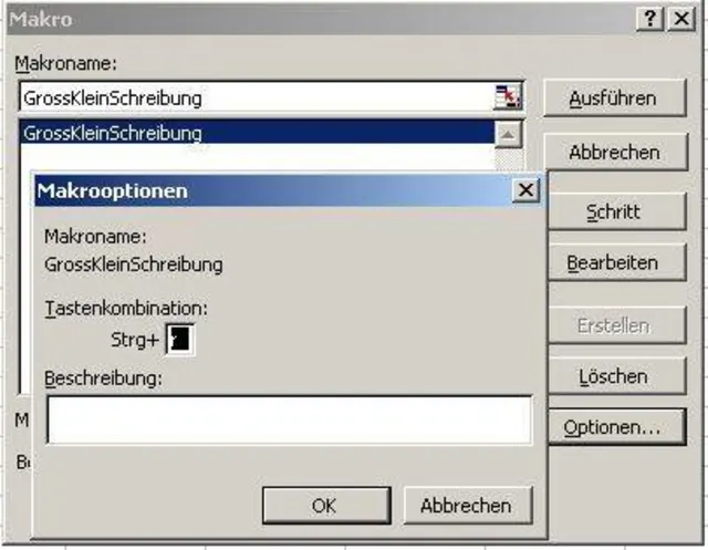 Diesem Makro können wir nun eine Tastenkombination zuweisen. Mit den Tasten Alt+F8 gelangen Sie ins Makro-Menü. Dort sehen Sie in der Liste das neu erstellte Makro mit dem Namen GrossKleinSchreibung. Klicken Sie es an und wählen dann "Optionen". Nun können Sie die Tastenkombination wählen. Ich habe "r" eingegeben. Mit "OK" und "Abbrechen" gelangen Sie zurück in Excel und können das neue Makro gleich einmal ausprobieren. Schreiben Sie in eine Zelle einen beliebigen Text und drücken "Return". Danach wählen Sie die Zelle mit der Maus oder der Tastatur an und drücken Control und den von Ihnen gewählten Buchstaben (bei mir ist das Ctrl+r). Der Text sollte nun zuerst ganz klein geschrieben sein. Bei nochmaligem Drücken wird er gross und beim dritten Mal wird nur der erste Buchstabe gross.