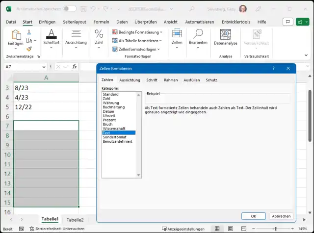 Sie haben eine Spalte, in der Sie Werte wie 4/23, 12/22 und ähnlich eingeben. Diese sind zwar von Monaten und Jahren inspiriert, aber Sie wollen diese Daten als Bezeichnungen benutzen. Darum möchten Sie diese exakt so in der Zelle wissen, wie Sie diese eingegeben haben. Excel soll Ihnen nicht dreinpfuschen, sprich: Ihre Inhalte nicht verändern.