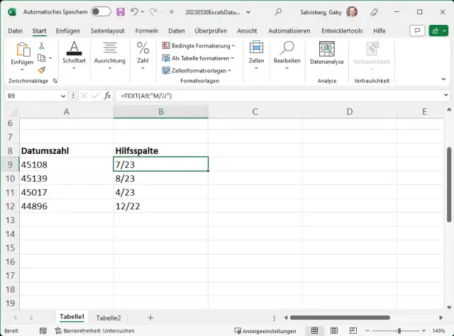 Lösung: Soll aus den Datumszahlen wie 45108, 45139 usw. nachträglich ein Textinhalt wie 7/23, 8/23 werden? Am besten gehen Sie so vor: Fügen Sie vorübergehend eine neue Spalte ein, die Sie als Hilfsspalte benutzen. Angenommen, die erste Datumszahl steht in A9, die Hilfsspalte ist Spalte B. Geben Sie in B9 die Formel =TEXT(A9;"M/JJ") ein und ziehen Sie diese in die restlichen Zeilen in dieser Spalte herunter. Schon stimmt zumindest die Darstellung wieder.