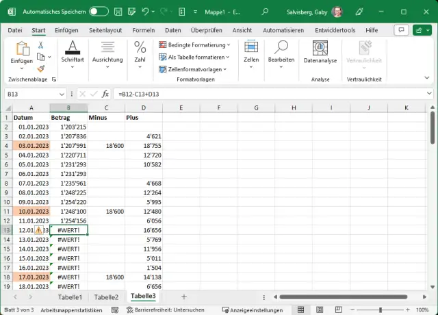 Angenommen, Sie haben in Spalte A Kalenderdaten, in Spalte B befindet sich pro Datum ein Kontostand. Dieser soll berechnet werden, indem zum vorherigen Kontostand die Zahl in Spalte C subtrahiert und jene in Spalte D addiert wird. Normalerweise ein Klacks – für B3 wäre es: =B2-C3+D3. Das sollte auch funktionieren, wenn manche der Zellen leer sind. Doch dann spuckt Excel #WERT-Fehler aus.