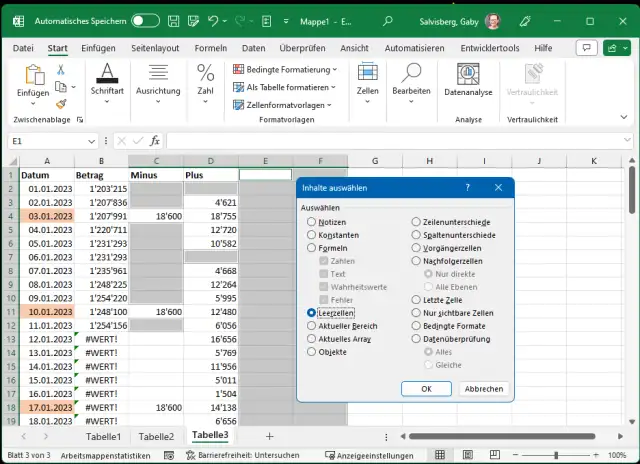 Sind die Zellen wirklich leer? Gehen Sie im Reiter Start via Bearbeiten/Suchen und Auswählen zu Inhalte auswählen. Aktivieren Sie Leerzellen und klicken Sie auf OK. Excel hinterlegt nun im benutzten Tabellenbereich all jene Zellen mit grauer Farbe, die tatsächlich leer sind. Und da entdecken Sie es schon: In unserem Beispielblatt sind in der Spalte C die meisten Zellen von C2 bis C12 tatsächlich leer. Aber die leer erscheinenden Zellen ab C13 sind nicht hervorgehoben. Das heisst: Diese Zellen enthalten irgendein Zeichen, etwa ein Leerzeichen oder ein anderes unsichtbares Zeichen. Vielleicht ist dieses beim Kopieren oder Importieren hineingeraten.