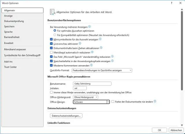Öffnen Sie eine der Office-Anwendungen, zum Beispiel Word. Gehen Sie via Datei zu Optionen. Im Bereich Allgemein unter Microsoft Office-Kopie personalisieren wählen Sie beim Office-Design die Einstellung Schwarz und klicken auf OK. Falls Sie Windows selbst schon auf den Dunkelmodus getrimmt haben, können Sie anstelle zu Schwarz auch zu Systemeinstellung verwenden greifen. Damit wird übrigens jedes Office-Programm diesen Modus verwenden, also auch Outlook und PowerPoint.