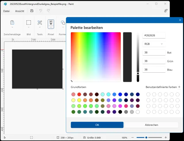 Wenn Sie einen schwarzen oder dunkelgrauen Hintergrund verwenden, bleiben die Gitternetzlinien erhalten. Und dieser Hintergrund erfordert das Hinterlegen eines Bildes in der gewünschten Farbe. Öffnen Sie das kleine Windows-Zeichnungsprogramm Paint. Markieren Sie einen ungefähr 250 × 200 Pixel grossen Bereich und benutzen Sie das Zuschneiden-Symbol. Grösser muss das Bild nicht sein. Schnappen Sie sich die Palette und legen Sie darin beispielsweise ein sehr dunkles Dunkelgrau fest; hier nehmen wir RGB 38/38/38. Klicken Sie auf OK. In den Tools finden Sie das Füllen-Werkzeug und klicken in die Fläche. Voilà, ein fast schwarzes Rechteck. Speichern Sie die Datei im Format .png beispielsweise in C:\Benutzer\IhrName\Dokumente\Vorlagen.