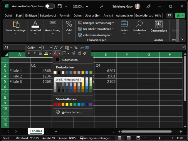 Noch schlimmer wirds, wenn Sie die Datei weitergeben oder auf einem anderen Computer öffnen: Dort fehlt das Hintergrundbild, jedoch nicht die Schriftfarbe, weshalb in dieser Datei der Hintergrund wieder weiss erscheint. Weisse Schrift auf weissem Hintergrund bedeutet: Die Tabelle sieht komplett leer aus. Der Empfänger der Datei müsste in diesem Fall entweder wieder selbst ein Hintergrundbild einfügen oder die gesamte Tabelle markieren und die Schriftfarbe wieder auf Schwarz umstellen.