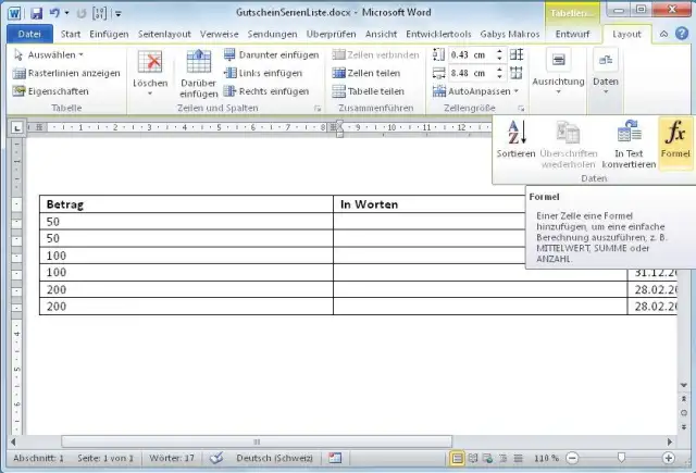 Quelle: PCtipp.chWitziges Detail: Word selbst könnte übrigens auch Zahlen in Worten ausgeben. Der Haken dabei: In Word können Sie die Formel nicht automatisch in die restlichen Zellen ausfüllen. Vielleicht wollen Sie mit der Funktion trotzdem einmal herumspielen: Erstellen Sie in Word zuerst eine Datei mit Ihrer Tabelle. In der ersten Spalte haben Sie beispielsweise den Betrag, in der zweiten soll jener in Worten wiederholt werden und in der dritten vielleicht ein Gültigkeitsdatum. Setzen Sie auch entsprechende Spaltentitel («Betrag», «In Worten» und «Gültig bis»). Pflanzen Sie den Cursor in die erste leere Zelle in der zweiten Spalte und gehen Sie via Layout/Daten zu Formel.