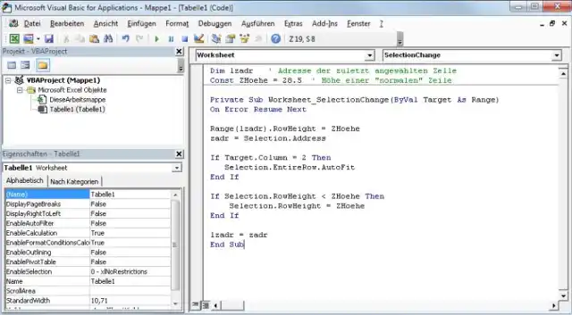 Öffnen Sie den VisualBasic Editor, indem Sie Alt+F11 drücken. Klappen Sie in der linken Fensterhälfte allenfalls «Microsoft Excel Objekte» auf und doppelklicken Sie den Namen der betroffenen Tabelle (z.B. «Tabelle1»). Nun kopieren Sie den folgenden Makro-Code ins grosse leere (weisse) Feld. Damit wird sich das Makro später ausdrücklich in jener Tabelle anwenden.