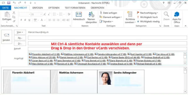 Outlook erstellt dann eine Mail mit sämtlichen vCards im Anhang. Diese verschiebt man in einen Ordner
