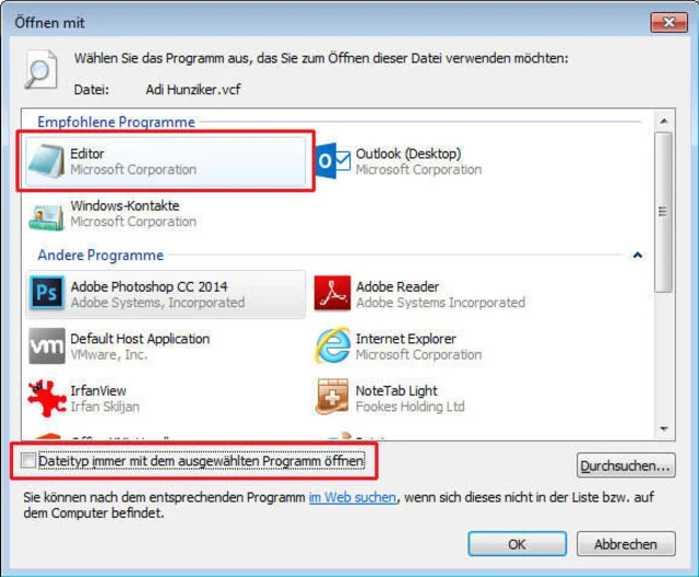 - Man öffnet zz_merge.vcf mit einem Texteditor (Rechtsklick auf die Datei, «Öffnen mit» -> «Standardprogramm auswählen» und dann unter «Andere Programme» den Editor (Notepad.exe) wählen bzw. suchen. Achtung: Das Häkchen «Immer mit diesem Programm öffnen» entfernen. Die vCard öffnet sich im Texteditor.