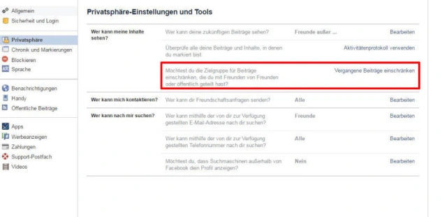 - Im Abschnitt Wer kann meine Inhalte sehen, klicken Sie auf Möchtest du die Zielgruppe für Beiträge einschränken, die du mit Freunden von Freunden oder öffentlich geteilt hast?