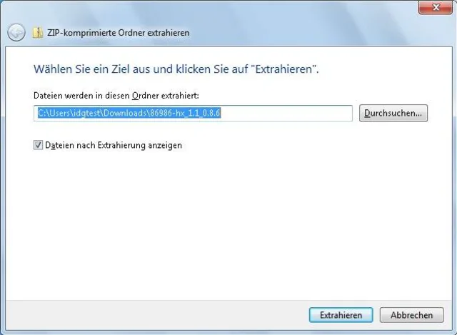 Speichern Sie die Zip-Datei hierfür zum Beispiel in Ihren Download-Ordner. Klicken Sie sie dort mit der rechten Maustaste an und wählen Alle extrahieren. Der Windows-Entzipper bietet automatisch an, für die entpackten Dateien einen neuen Ordner zu erstellen. Lassen Sie ihn gewähren, klicken Sie auf Extrahieren.