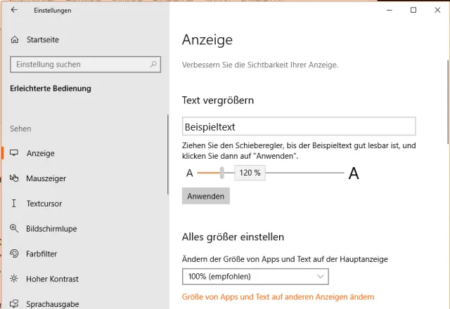 Auf hochauflösenden modernen Displays erscheint oft die Schrift etwas klein. Es gäbe zwar unter Start/Einstellungen/System/Anzeige bei Skalierung und Anordnung ein Ausklappmenü. Damit könnten Sie die Anzeige zum Beispiel auf 125 Prozent vergrössern oder über Erweiterte Skalierungseinstellungen einen eigenen Wert eingeben. Aber damit wachsen auch Icons, App-Fenster und Bedienelemente. Und die sind üblicherweise gross genug.
