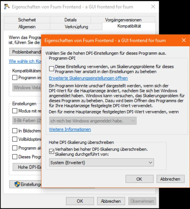 Im Reiter Kompatibilität klicken Sie auf Hohe DPI-Einstellungen. Aktivieren Sie Verhalten bei hoher DPI-Skalierung überschreiben und wählen Sie bei Skalierung durchgeführt von den Eintrag System (Erweitert), Bild 8. Klicken Sie in beiden Fenstern auf OK, schliessen und öffnen Sie die Anwendung.