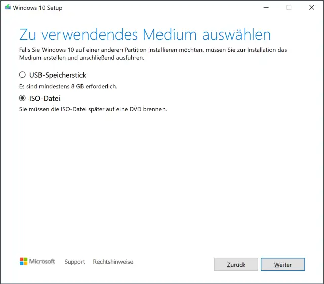 Laden Sie via Tool jetzt herunterladen das Media Creation Tool herunter. Führen Sie es aus und akzeptieren Sie die Lizenzbedingungen. Bei Wie möchten Sie vorgehen? wählen Sie Installationsmedien (…) für einen anderen PC erstellen. Klicken Sie auf Weiter.