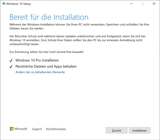 Quelle: Screenshot/PCtipp.chSchliessen Sie andere Programme und akzeptieren Sie die Lizenzbedingungen. Windows wählt bereits standardmässig die Option aus, dass persönliche Dateien und Apps behalten werden, Bild 15. Falls nicht (oder falls Sie daran etwas ändern möchten), klicken Sie auf Ändern der zu behaltenden Elemente. Klicken Sie auf Installieren, legt die Reparatur- und Update-Installation los. Jetzt können Sie nur noch warten, bis sie fertig ist.