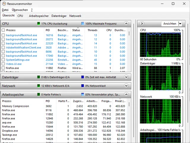 Der Ressourcenmonitor (ebenfalls erreichbar via Windows-Suche) bietet noch tiefere Einblicke, Bild 1.