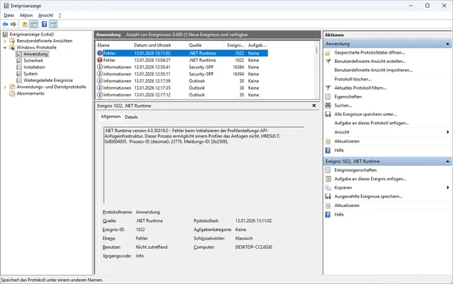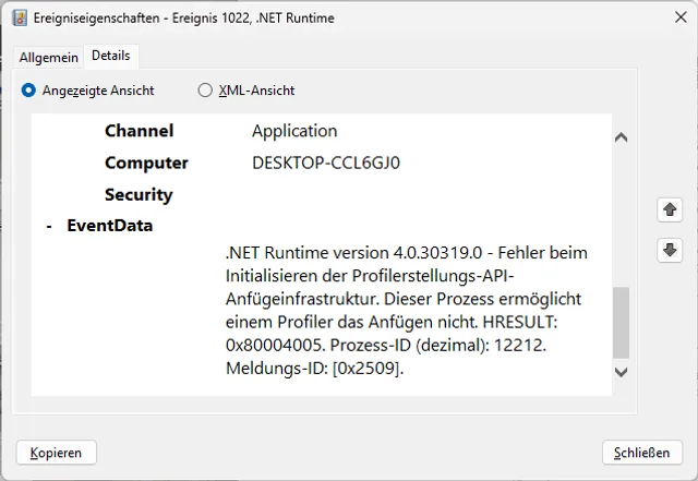 Ein konkretes Beispiel soll zeigen, wie man bei der Ursachenforschung vorgeht: Die Fehlermeldung lautet Ereignis-ID 1022: .NET Runtime version 4.0.30319.0 – Fehler beim Initialisieren der Profilerstellungs-API-Anfügeinfrastruktur. Dieser Prozess ermöglicht einem Profiler das Anfügen nicht. HRESULT: 0x80004005. Prozess-ID (dezimal): 10040. Meldungs-ID: [0x2509].