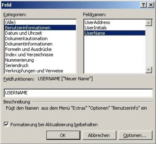 Fügen Sie ein Feld mit der Benutzerinformation in Ihre Worddokumentvorlage ein. Wählen Sie dazu im Menü "Einfügen" den Menüpunkt "Feld..."