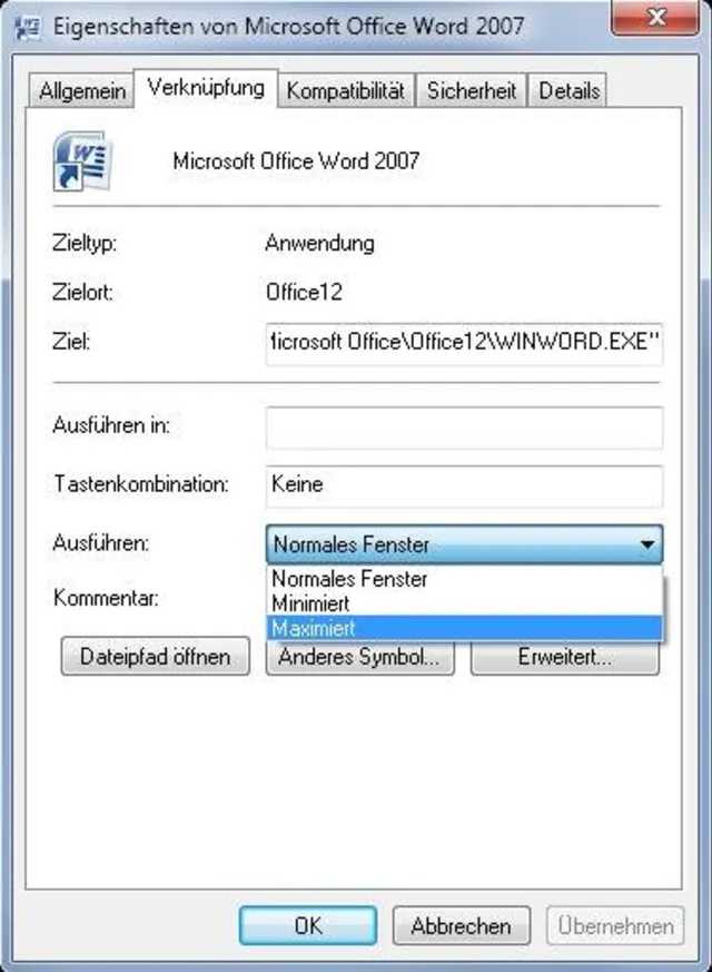 Quelle: PCtipp.chIm Reiter Verknüpfung ist hinter «Ausführen» wahrscheinlich jetzt «Normales Fenster» eingestellt. Ändern Sie diese Einstellung auf «Maximiert» und klicken Sie auf OK. Jetzt sollte die Software - in diesem Fall Word - automatisch maximiert starten, wenn Sie diese Verknüpfung benutzen. Wiederholen Sie die Prozedur auch für alle anderen Anwendungen, von denen Sie sich dasselbe wünschen. (PCtipp-Forum)