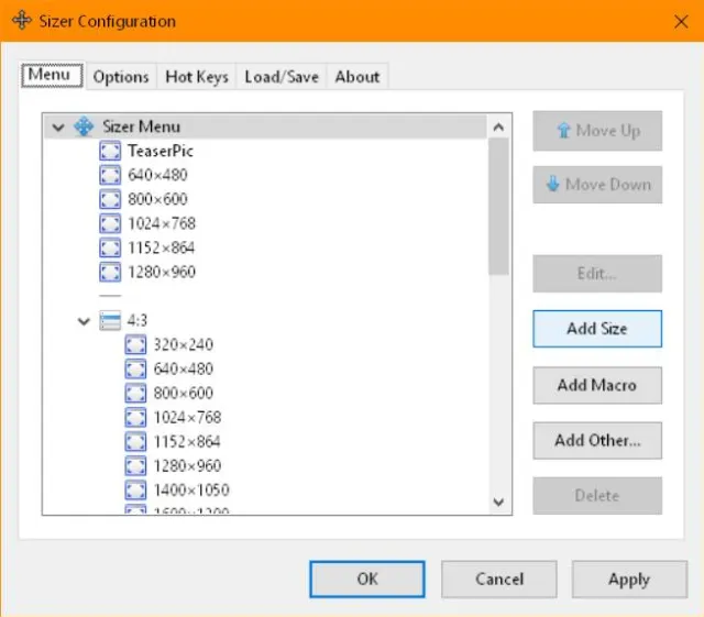 Legen Sie in Sizer benutzerdefinierte Fenstergrössen fest