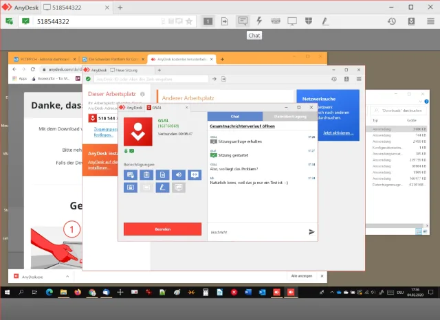 Über die Art des PC-Problems können Sie sich natürlich weiterhin per Telefon unterhalten. Das ist meistens das effizienteste. Sie können stattdessen aber auch direkt im AnyDesk-Fenster miteinander chatten. Der User sieht den Chat in einer Spalte in seinem AnyDesk-Fenster, der Support hat am oberen Rand ein Chat-Icon, über das er die Nachrichten schicken und die Antworten lesen kann.