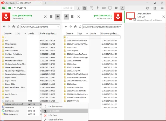 Das Blatt-Papier-Symbol mit dem nach rechts zeigenden Pfeil dient dem Hoch- oder Herunterladen von Dateien. So kann der Support dem Nutzer zum Beispiel eine Treiberdatei oder einen Registry-Fix direkt auf den Computer laden: In der linken Spalte sieht er seinen eigenen Verzeichnisbaum, in der rechten jenen des Users. Er wählt links den Quellordner, rechts den Zielordner, klickt bei sich eine Datei mit rechts an und wählt Hochladen. Schon landet die Datei im Zielordner beim User.