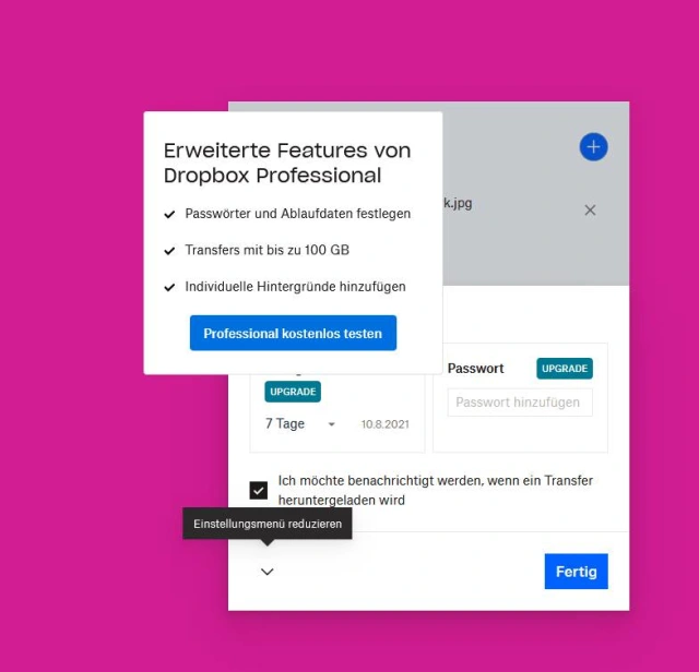 Wer möchte, dass Links länger als 7 Tage gültig sind und ein Passwort verwenden möchte, der braucht die kostenpflichtige Pro-Version