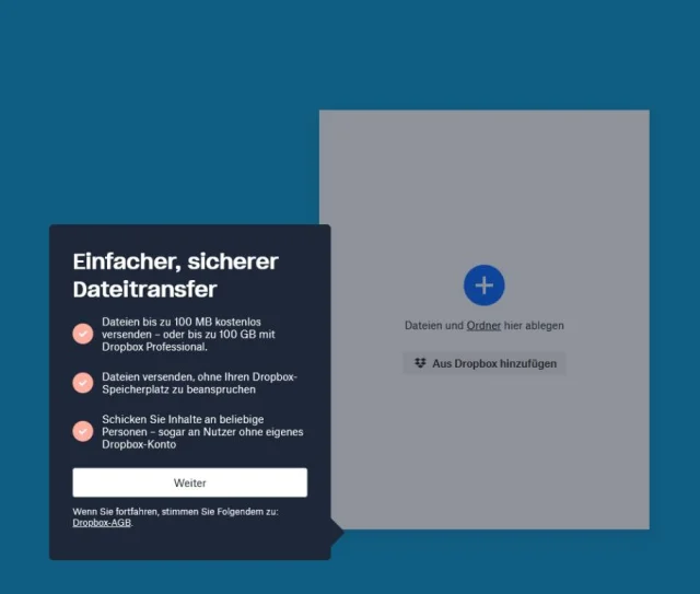 Mit der Gratisversion von Dropbox Transfer können Sie nur 100 MB verschicken