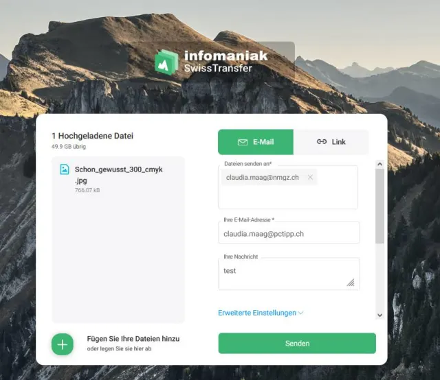 Die Daten können Sie per E-Mail schicken oder via Link teilen. Unter den Erweiterten Einstellungen finden Sie die Gültigkeitsdauer (max. 30 Tage), das Download-Limit (max. 1000-mal) sowie die Sprachoptionen (Englisch, Französisch, Deutsch, Italienisch, Spanisch). Die kostenlose Version bietet ausserdem die Möglichkeit, ein Kennwort zu setzen (ganz unten bei Erweiterte Einstellungen).