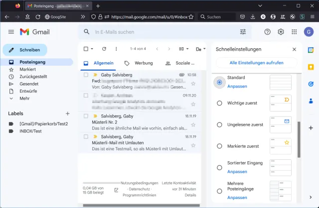 Lösung: Um die Filterzeilen wieder auszublenden, öffnen Sie oben rechts via Zahnradsymbol die Einstellungen. Scrollen Sie in der Schnelleinstellungen-Spalte bis zu Art des Posteingangs herunter und schalten Sie von Mehrere Posteingänge auf Standard um. Schliessen Sie die Einstellungen-Spalte übers X, sind die Platzfresser verschwunden.