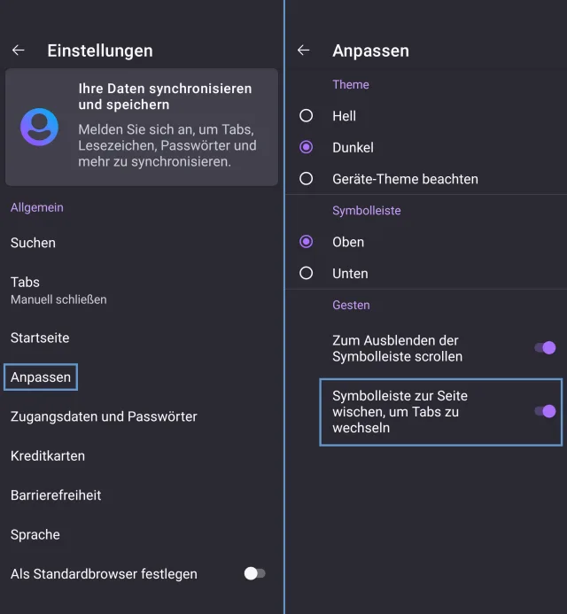 Firefox für Android: Horizontales Tab-Wischen ausschalten