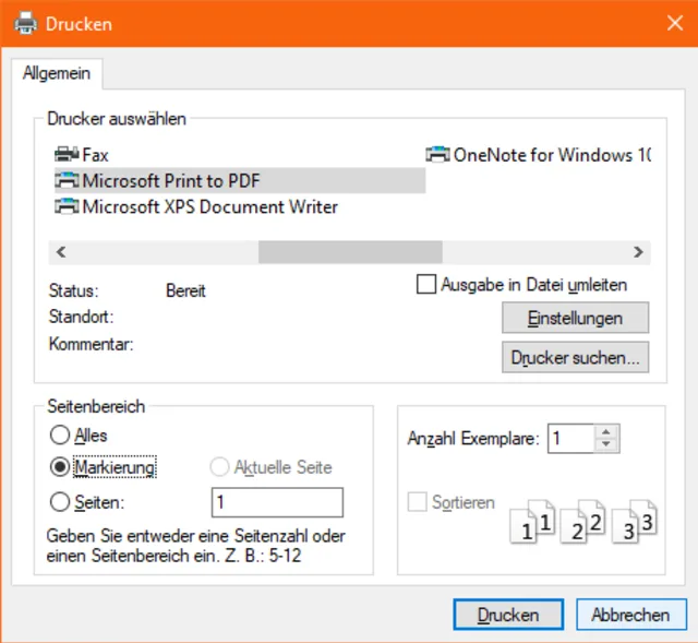 Quelle: PCtipp.chFertig markiert? Gehen Sie im Firefox-Menü zu Drucken. Es öffnet sich zunächst die normale Druckvorschau fürs ganze Dokument. Klicken Sie aber oben links auf die Schaltfläche Drucken. Und schon erscheint ein Druckdialog mit einer kleinen aber feinen Einstellungsmöglichkeit. Im Feld «Seitenbereich» entdecken Sie Markierung drucken. Schalten Sie auf dieses um und klicken Sie auf Drucken. Es landet nur das auf dem Papier bzw. im PDF, das Sie zuvor mit Hilfe der Maus und der Ctrl-/Strg-Taste markiert haben. (PCtipp-Forum)