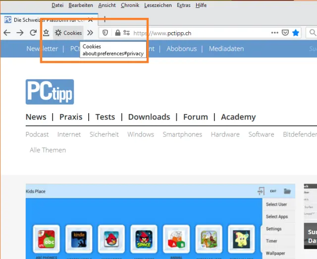 Quelle: PCtipp.chVoilà, ab sofort haben Sie im Firefox (siehe oben im linken Bereich der Symbolleiste, das Zahnrad-Icon mit dem «C» für «Cookies») einen direkten Zugang zum gewünschten Bereich der Einstellungen. Aufgepasst: Falls Sie diese in einem neuen Tab öffnen möchten, halten Sie während des Klicks darauf die Ctrl- bzw. Strg-Taste gedrückt.