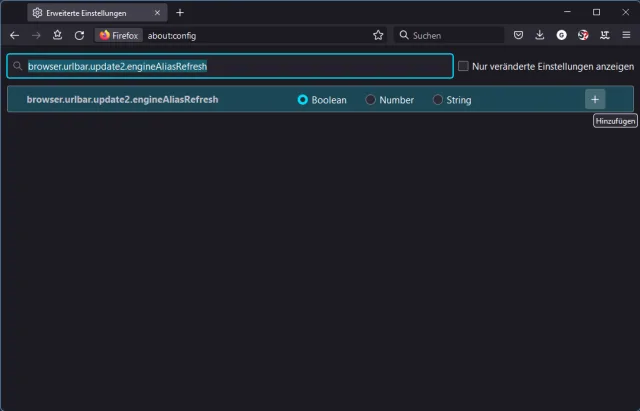 Fügen Sie den Eintrag browser.urlbar.update2.engineAliasRefresh hinzu und schalten Sie ihn auf «true»