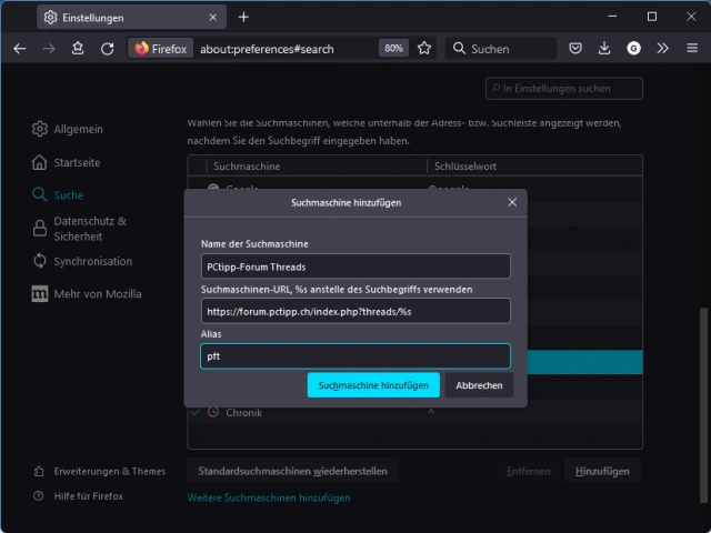 Jetzt lässt sich in Firefox dieselbe Methode wie in Chrome verwenden, um eine individuelle Suche einzubauen