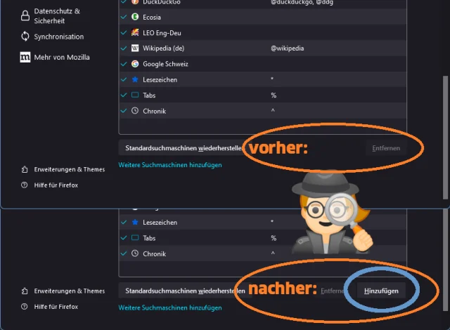 Aber für Firefox gibts einen weiteren versteckten Weg, der auch das Hinzufügen per Chrome-Methode erlaubt. Der Vorteil davon: Falls Sie mit einem separaten Suchfeld arbeiten, erscheint die so hinzugefügte Suche auch, wenn Sie das Suchfeld aufklappen.