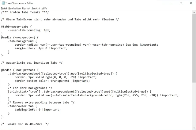 /*** Proton Tabs Tweaks ***//* Obere Tab-Ecken nicht mehr abrunden und Tabs nicht mehr floaten */#tabbrowser-tabs { --user-tab-rounding: 0px;}@media (-moz-proton) { .tab-background { border-radius: var(--user-tab-rounding) var(--user-tab-rounding) 0px 0px !important; margin-block: 1px 0 !important; }}/* Aussenlinie bei inaktiven Tabs */@media (-moz-proton) { .tab-background:not([selected=true]):not([multiselected=true]) { border: 1px solid rgba(0, 0, 0, .20) !important; border-bottom-color: transparent !important; } /* For dark backgrounds */ [brighttext="true"] .tab-background:not([selected=true]):not([multiselected=true]) { border: 1px solid var(--lwt-selected-tab-background-color, rgba(255, 255, 255, .20)) !important; } /* Remove extra padding between tabs */ .tabbrowser-tab { padding-left: 0 !important; }}/* Tweaks von 07.06.2021 */