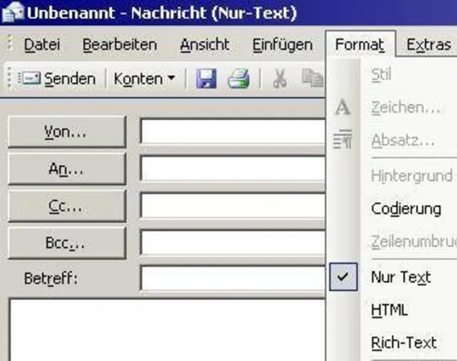 Oder wenn Sie nur ab und zu eine formatierte Mail versenden möchten, dann können Sie dies auch direkt in der neuen Mail ändern. Im Menü "Format".