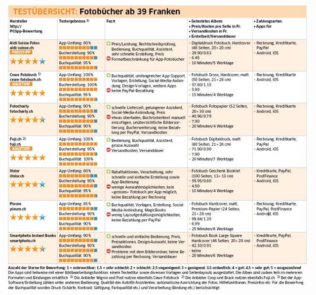 Der PCtipp hat in dieser Kaufberatung sieben Anbieter von Fotobücher-Apps getestet. Alle Ergebnisse zu unserem Test finden Sie in der Testtabelle. Die Fotobuchanbieter Coop, Migros, Post und Brack haben wir nicht extra in der Tabelle aufgeführt, denn sie nutzen entweder die Software und den Druck von Cewe Fotobuch (Migros und Post) oder den von Fuji.ch (Brack und Coop). Einziger Unterschied zu den Originalherstellern: Bei Coop, Migros und Post lassen sich die Bücher auf Wunsch an eine Filiale in der Nähe liefern und bar bezahlen. Die Versandkosten entfallen also. Bewusst verzichtet hat der PCtipp bei dieser Kaufberatung auf einen Testsieger. Warum? Weil die mobilen Apps der einzelnen Hersteller nicht nur zu unterschiedlich aufgebaut sind, sondern weil auch die angebotenen Buchformate zu stark divergieren und so die Ergebnisse/Preise nicht direkt miteinander vergleichbar sind. Aus diesem Grund haben wir uns darauf konzentriert zu zeigen, was derzeit mit Apps möglich ist, um ein hochwertiges Fotobuch zu erstellen. Als Entscheidungshilfe empfehlen wir aber drei Anbieter, die uns besonders gefallen haben. Sie werden in jeweils separaten Boxen besprochen. Zu unseren Voraussetzungen bei der Anbieterwahl: Es muss ein Einband aus Hardcover zur Verfügung stehen. Zudem muss es möglich sein, unsere hochauflösenden Testfotos mittels automatischem Assistenten in das Fotobuch zu integrieren.