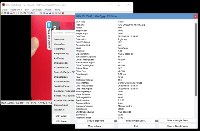 Etwas sehr Ähnliches, wenn auch nicht ganz so hübsch, klappt übrigens auch mit IrfanView, dem kostenlosen kleinen Alleskönner. Öffnen Sie darin ein Bild und gehen Sie zu Bild/Informationen/EXIF-Daten. Über die entsprechenden Buttons lassen Sie sich den im Bild gespeicherten Aufnahmeort in Google Earth, auf Google Maps oder in der OpenStreet-Map anzeigen.