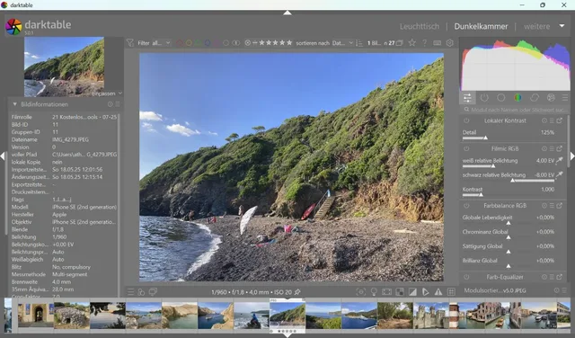Quelle: PCtipp.chDie importierten Bilder liegen auf dem Leuchttisch. Per Doppelklick auf eine Aufnahme kommt sie in die Dunkelkammer, Bild 11. Rechts neben dem Foto sind die verschiedenen Module zu sehen, die Darktable enthält. Normalerweise sind die meisten deaktiviert. Erst durch einen Klick auf die jeweilige Einschaltfläche oben links oder durch Verändern eines ihrer Regler werden sie aktiviert. Ihre Schaltfläche zeigt zur besseren Übersicht nur die genutzten Module.