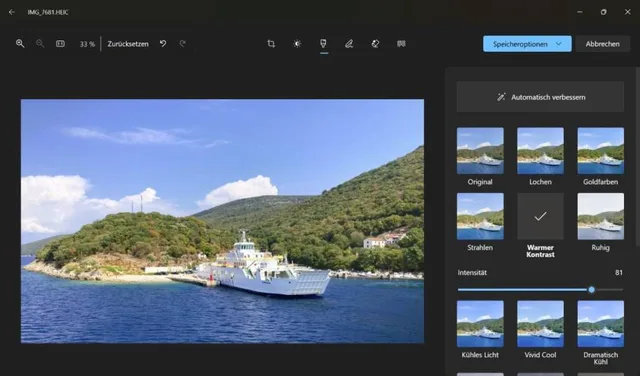 Über den Malpinsel gelangen Sie zu den Filtern, die jeweils ein ganzes Set an geänderten Werten mitbringen. So können Sie hier zum Beispiel Warmer Kontrast auswählen und anschliessend noch per Regler die Intensität anpassen, Bild 5. Die Fotos-App enthält zudem eine KI-Funktion, um Ihre Aufnahme automatisch zu verbessern.