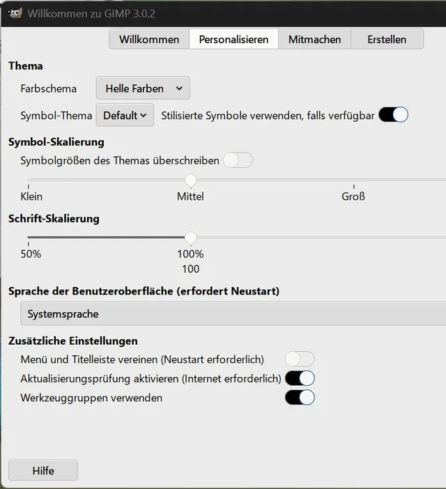 Bild 6: Das Willkommensfenster in Gimp 3.0 erlaubt das Personalisieren der Oberfläche