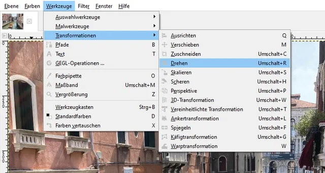Quelle: PCtipp.chDie Foto-Software Gimp bietet die üblichen Bearbeitungsmöglichkeiten, allerdings sind diese teils gut versteckt. Beispielsweise müssen Sie erst das Menü Werkzeuge und danach Transformationen aufrufen, um ein Foto zu drehen, neu auszurichten oder seine Perspektive zu ändern, Bild 8.