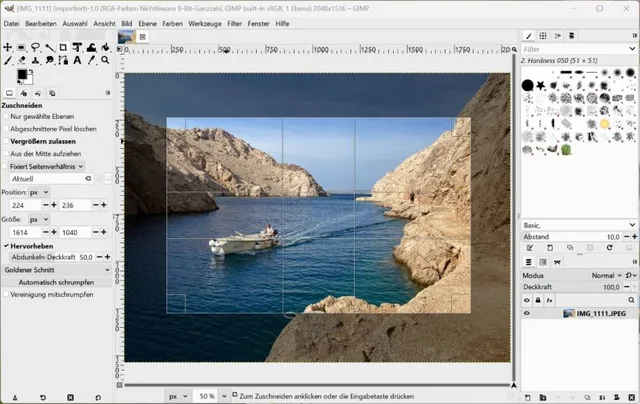 Quelle: PCtipp.chJe nach gewähltem Werkzeug ändern sich die angezeigten Optionen. So ist beim Zuschneiden eines Bildes unten links meist Keine Hilfslinien ausgewählt. Diese Linien sind aber recht nützlich. Eine Alternative ist der Goldene Schnitt, der ein Bild harmonisch und ausgewogen wirken lässt, Bild 9. Weitere Tipps etwa zum Weissabgleich, für Änderungen von Helligkeit, Kontrast und Farben sowie zum Maskieren in Gimp finden Sie unter der Internetadresse go.pctipp.ch/3441.